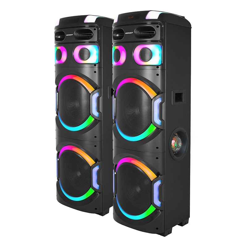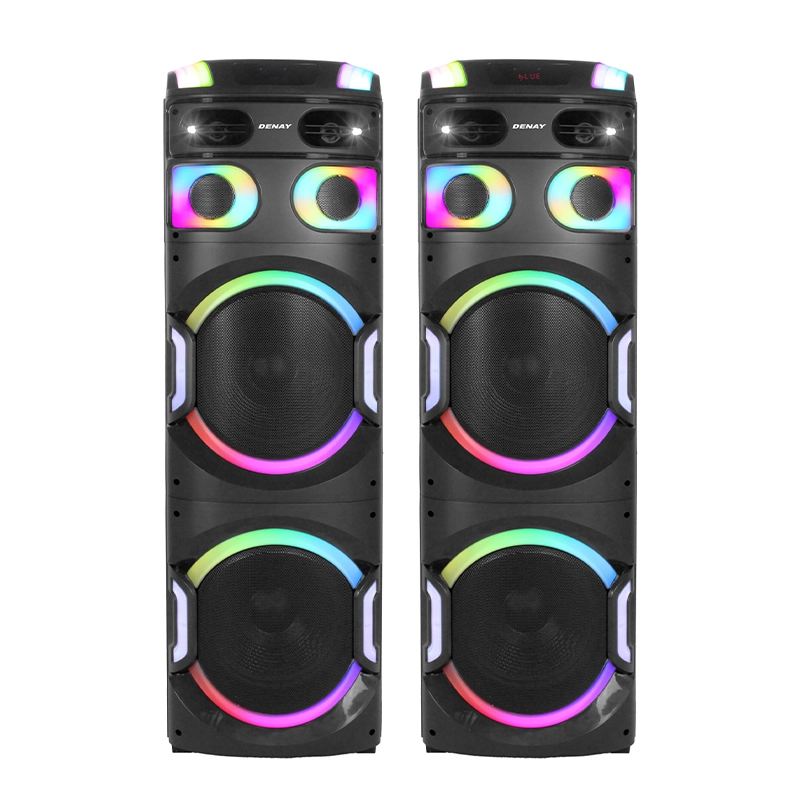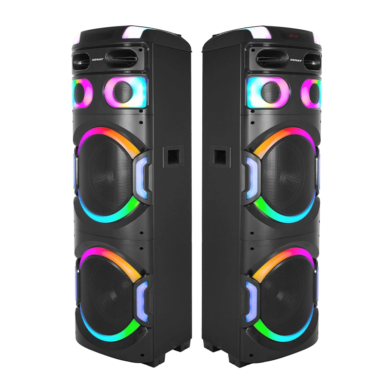 مدل: WB2012DJ9RWSبرند: دنای (Denay)نوع دستگاه: اسپیکر دیجی دار ایستادهتوان خروجی واقعی (RMS): 2 × 120 وات (جمعاً 240 وات)تعداد سابووفر: 4 عدد (12 اینچ، از نوع اکتیو با آمپلیفایر داخلی)تعداد میدرنج: 1 عدد (5 اینچ در هر باکس)تعداد سوپرتوییتر: 2 عدد در هر باکسجنس بدنه: MDF (ضد لرزش و مقاوم)رنگ بدنه: مشکی براقابعاد: ارتفاع 140 سانتیمتر، عرض 40.5 سانتیمتر، عمق 40 سانتیمترویژگیهای صوتی و فنی:صدای استریو و قدرتمندبیس عمیق و واضحآمپلیفایر داخلی با تفکیک صدای بالاتنظیم صدا، بیس، تریبل و اکوحالت DJ Mode با آهنگهای پیشفرضدکمه MIC Tone Changer برای تغییر تون صدادرگاهها و اتصالات:بلوتوث نسخه 5.0دو پورت USB (پخش MP3 و شارژ)کارت حافظه TF (micro SD)AUXOptical (اپتیکال)Coaxial (کواکسیال)پورت گیتار الکتریک با کلید تنظیم صداورودی میکروفون بیسیم و باسیمقابلیتها:قابلیت کارائوکه (Karaoke)میکروفون بیسیم با تغییر تون صداریموت کنترل از راه دوررادیو FM داخلینمایشگر دیجیتال 7 Segment LEDطراحی و نورپردازی:بدنه MDF مقاوم در برابر رطوبت و حرارتطراحی دقیق برای گردش هوای مناسبرقص نور و نورپردازی زیبامنبع تغذیه: برق شهری