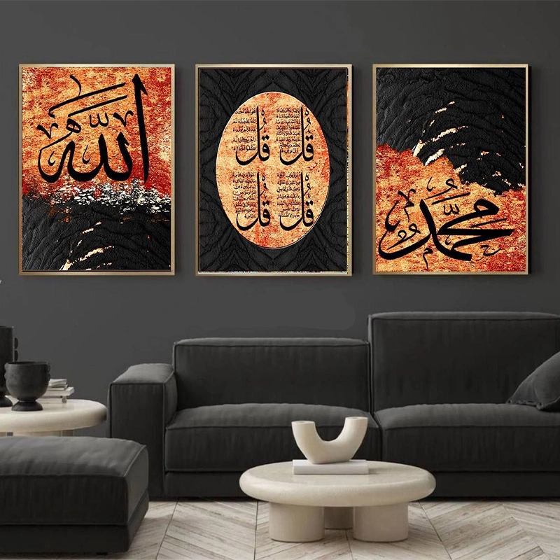 تابلو سهتکه شیشهای طرح چهارقل، الله و محمد با چاپ دیجیتال با رنگهای زنده و قاب مقاوم، جلوهای هنری و معنوی به فضای منزل، اتاق نشیمن یا دفاتر فرهنگی شما میبخشد و آماده نصب است.