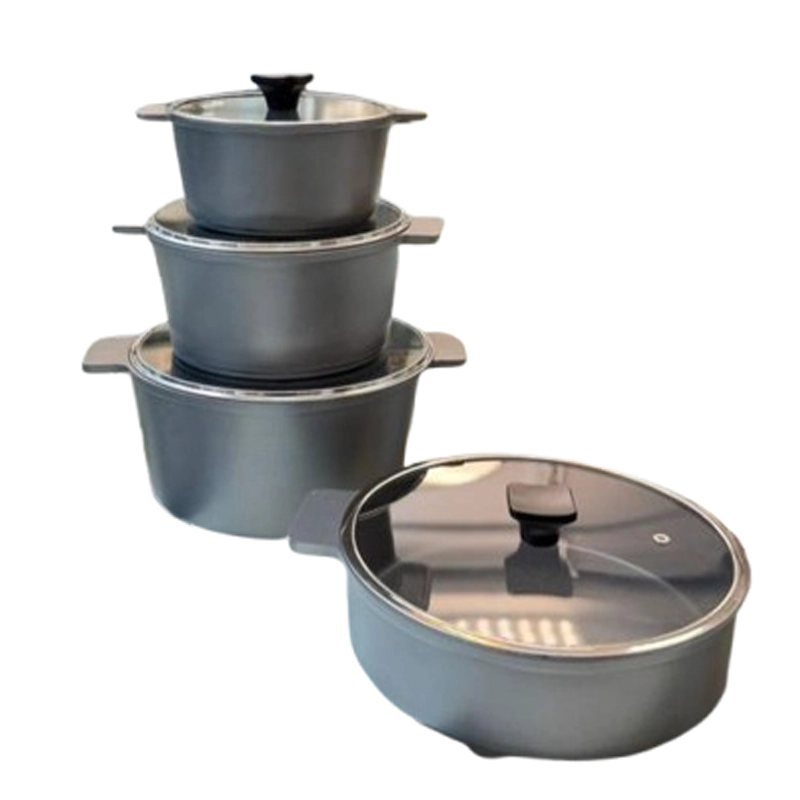 سرویس قابلمه ۸ پارچه چدن گرانیتی AMD با طراحی شیک، کف اینداکشن، دربهای پیرکس و مقاومت بالا، گزینهای عالی برای پخت سالم و یکنواخت غذاست. سایزهای متنوع و قابلیت شستوشو در ماشین ظرفشویی، آن را به انتخابی کاربردی برای هر آشپزخانه تبدیل کرده است.