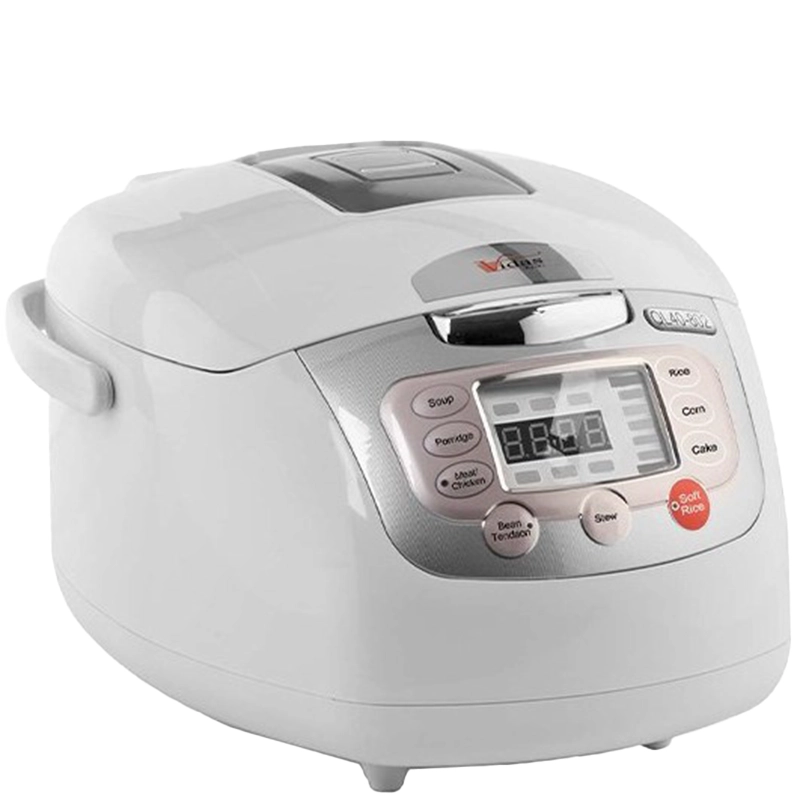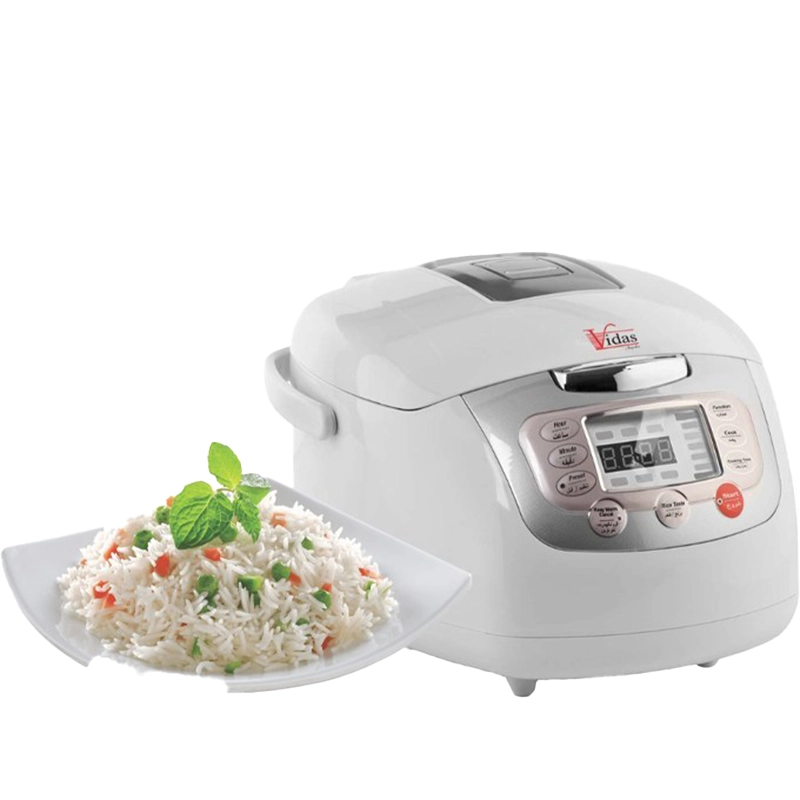پلوپز ویداس مدل VIR-5371 با ظرفیت ۱.۸ لیتر و توان 900 وات، چند کاره شامل پلوپز، آرامپز، بخارپز و گرمنگهدارنده، مجهز به قابلمه نچسب تفلون، تایمر تاخیری، منوی ترکیبی برنج و سیستم تهدیگساز با طراحی سفید و نمایشگر LCD.