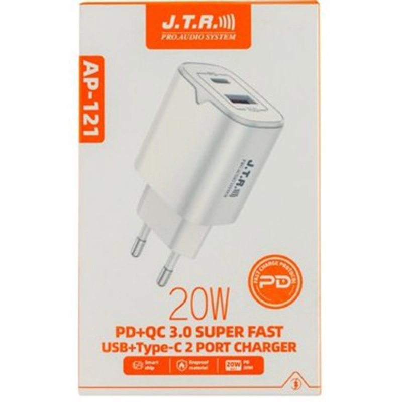 شارژر دیواری J.T.R مدل AP-121 با توان خروجی 20 وات، دو درگاه USB و Type-C و فناوری Quick Charge 3.0، شارژ سریع و ایمن را برای موبایل و تبلت فراهم میکند. بدنه سفید و مقاوم در برابر آتش و چیپست هوشمند کنترل جریان، این شارژر را به گزینهای مطمئن برای استفاده روزمره تبدیل کرده است.