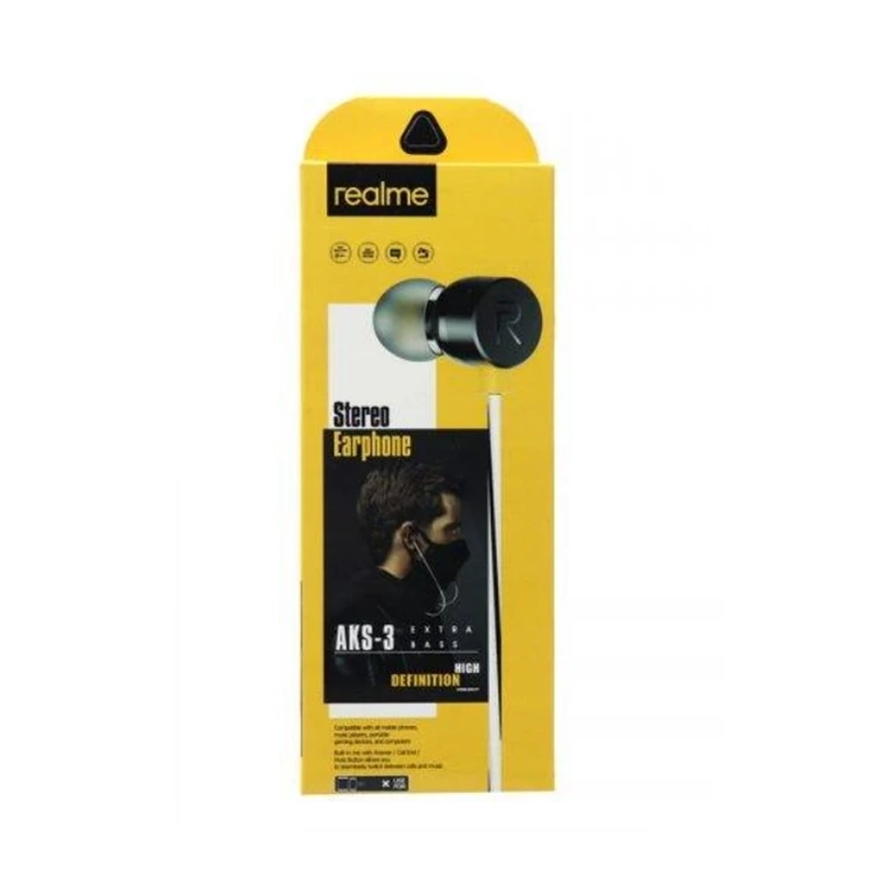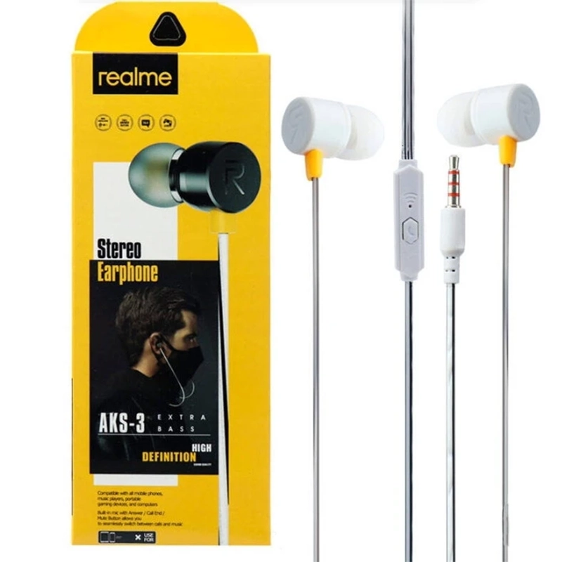 هندزفری ریلمی AKS-3 سیمی با سیم آلومینیومی مقاوم، میکروفون و ریموت، ارائه صدای واضح و راحتی استفاده طولانی مدت، مناسب برای تماس و موسیقی روزانه.