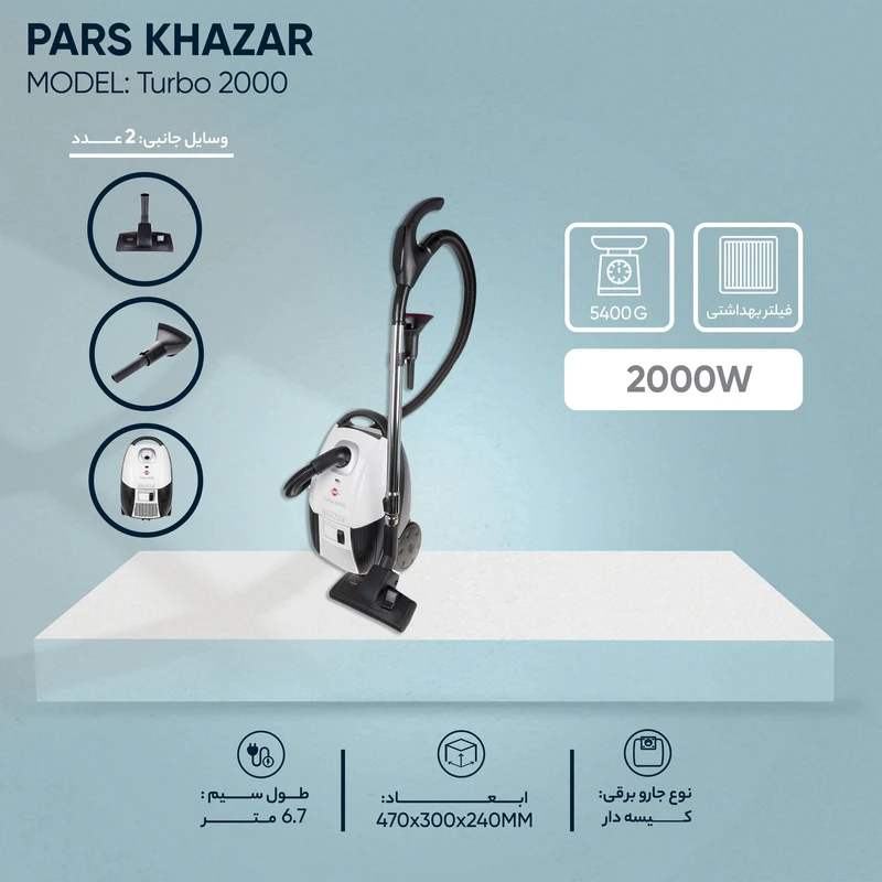 جاروبرقی پارس خزر مدل Turbo 2000 با توان ۲۰۰۰ وات و گرید انرژی A، دارای فیلتر قابل شستوشو، سیمجمعکن پدالی، سیستم دمنده و پارک افقی است. طراحی سبک با چرخش ۳۶۰ درجه خرطومی، کارایی بالا و عملکرد کمصدا را فراهم میکند.