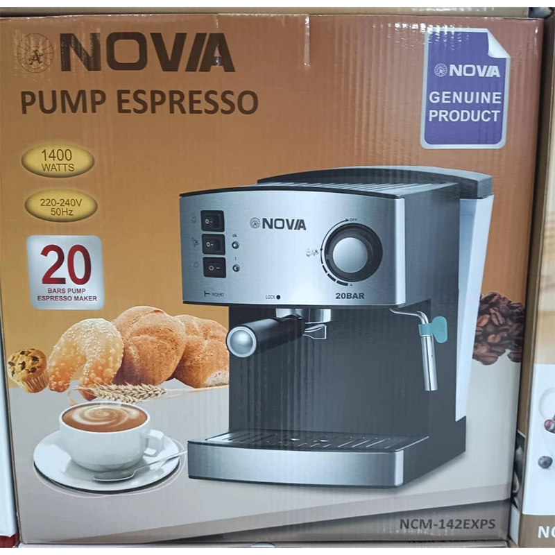 با سلام خدمت شما دوستان عزیز و گرامی اسپرسو ساز نوا 142 20بار 1400 وات نازل بخار برای درست کردن كاپوچينوساز،نسكافه ساز،لته،اب جوش،اسپرسو مخزن آب 1.6 لیتری مناسب برای استفاده خانگی پمپ اولکا تمام مس
