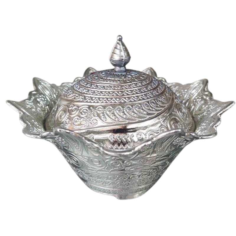 قندان گرد نقلی بزرگ از جنس استیل ترک با رنگ نقرهای زیبا، مقاوم و با طراحی شیک، مناسب پذیرایی و استفاده روزمره در منزل یا محیطهای رسمی.