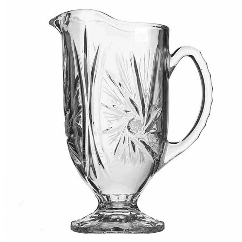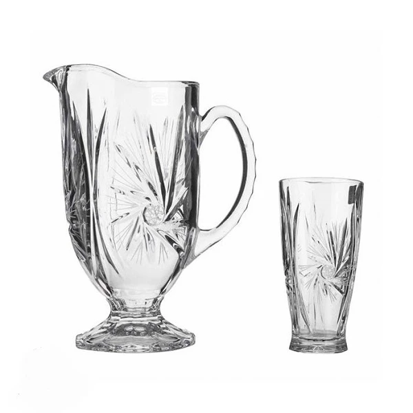 ست پارچ و لیوان ۷ پارچه مدل خورشیدی، شامل یک پارچ و ۶ لیوان کریستال شفاف، ساخت چین، مناسب پذیرایی و استفاده روزانه.