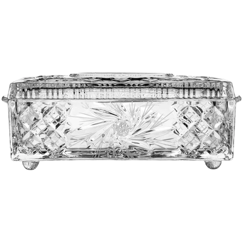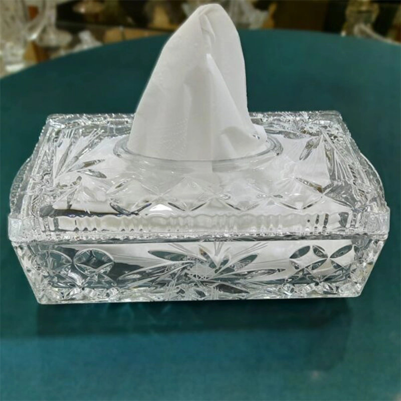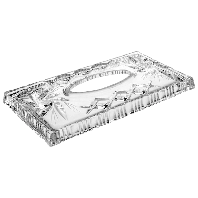 جا دستمال کاغذی کریستال خورشیدی، با ارتفاع ۹ سانتیمتر، طول ۲۱ سانتیمتر و عرض ۱۲ سانتیمتر، طراحی زیبا و جنس کریستالی شفاف.