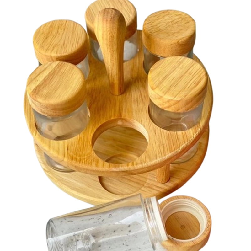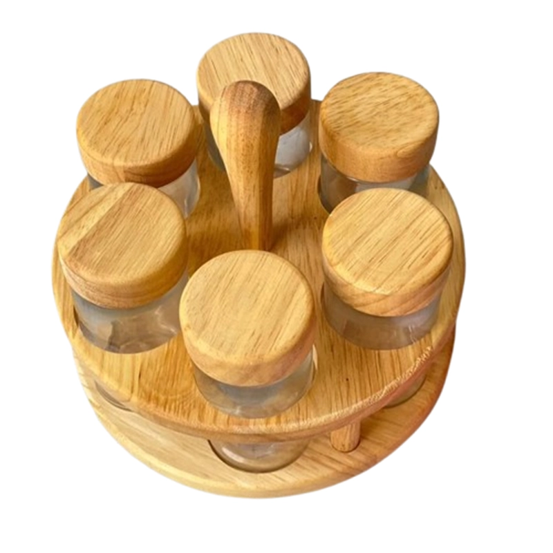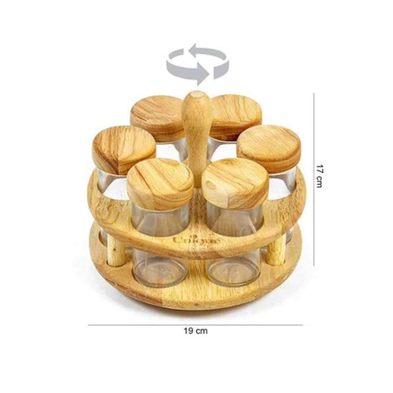 ست جا ادویه ۶ تایی گردان چوبی پانیذ از جنس رابروود، همراه با ادویهپاشهای شیشهای و گرداننده پیچی قابل جداشدن، یک انتخاب شیک و کاربردی برای نظمبخشی به آشپزخانه و دسترسی سریع به ادویههاست.