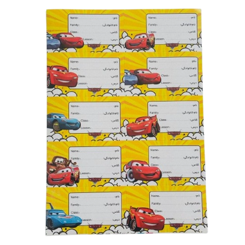 برچسب اسم و کلاس فانتزی طرح ماشین ها، ساختهشده از جنس گلاسه باکیفیت، مناسب برای مدرسه و استفاده شخصی.