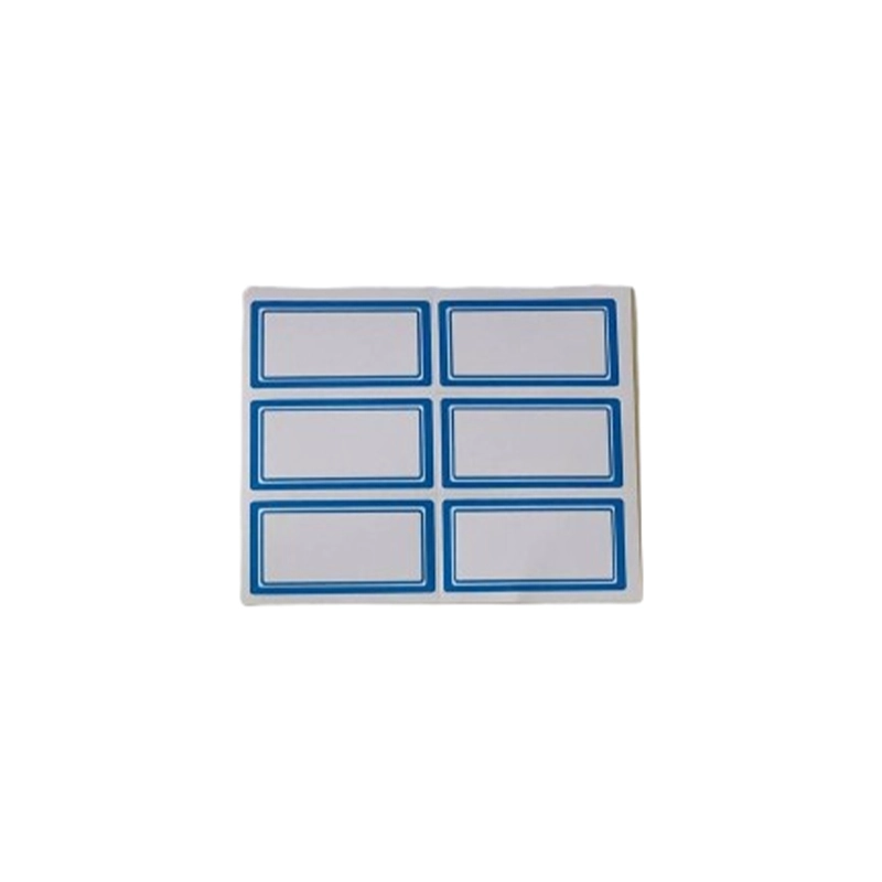 برچسب نام با طراحی ساده و دور آبی، ساختهشده از جنس گلاسه، مناسب برای استفاده روزمره و تحریر.