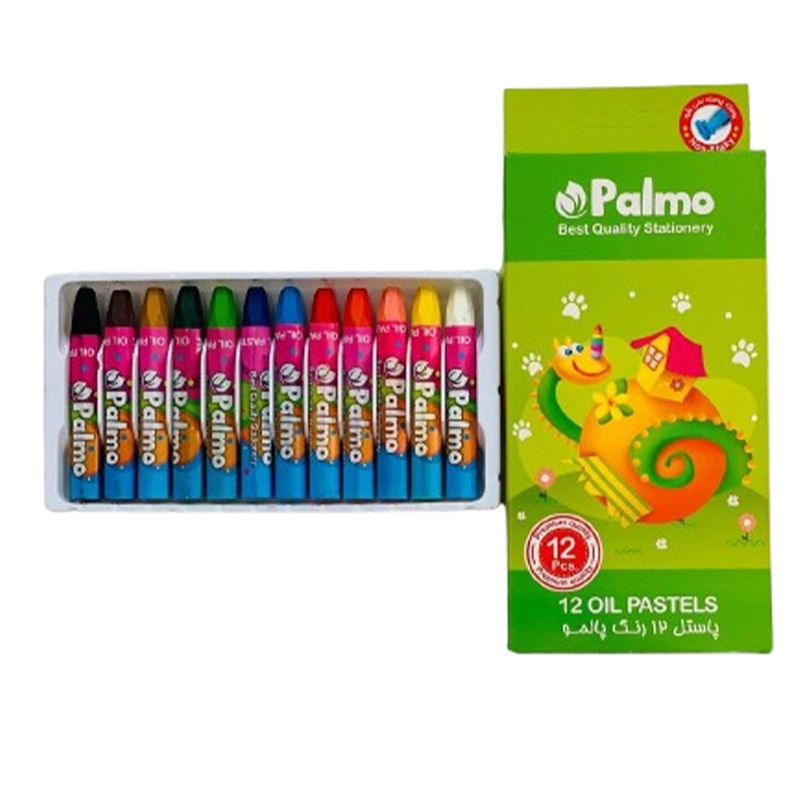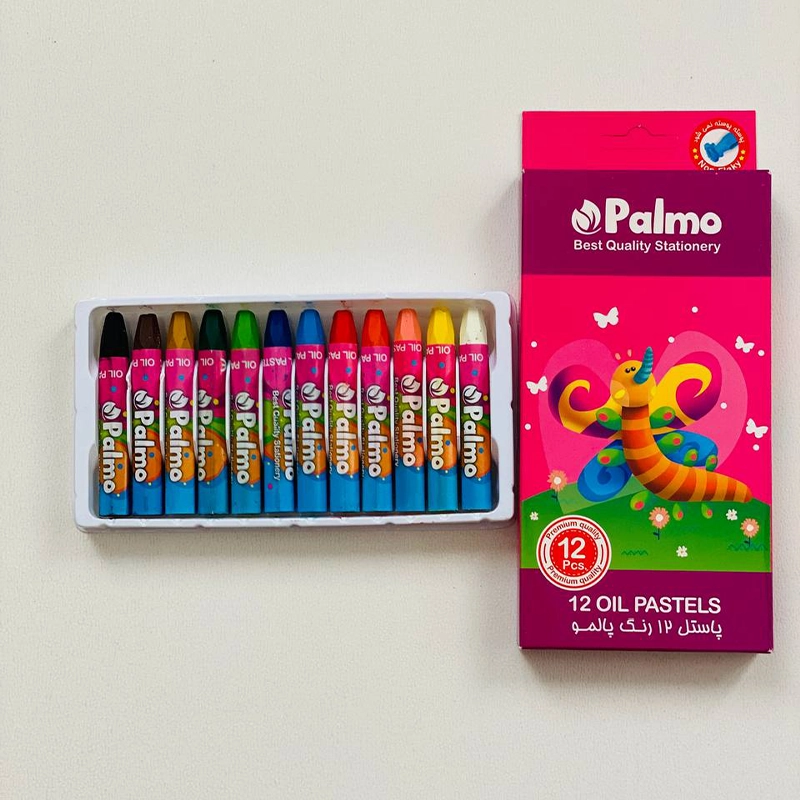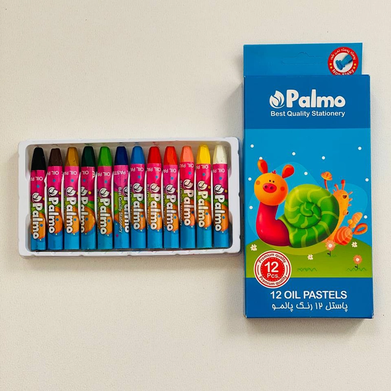 پاستل ۱۲ تایی پالمو با رنگهای متنوع سبز، صورتی و آبی، مناسب کودکان و هنرهای خلاقانه.