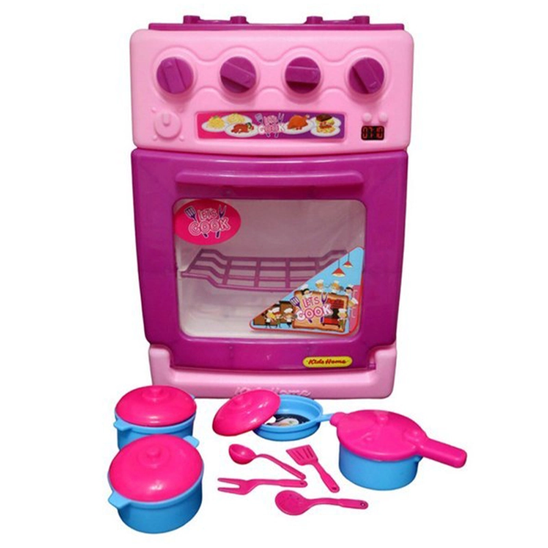 اسباب بازی ست آشپزخانه مدل اجاق گاز فر دار با ابعاد 20×13×37 سانتیمتر و وزن 350 گرم، شامل قابلمه، تابه، کفگیر و ملاقه، ساخته شده از مواد قابل شستوشو و مناسب کودکان برای تقویت مهارتهای آشپزی و بازی آموزشی است.