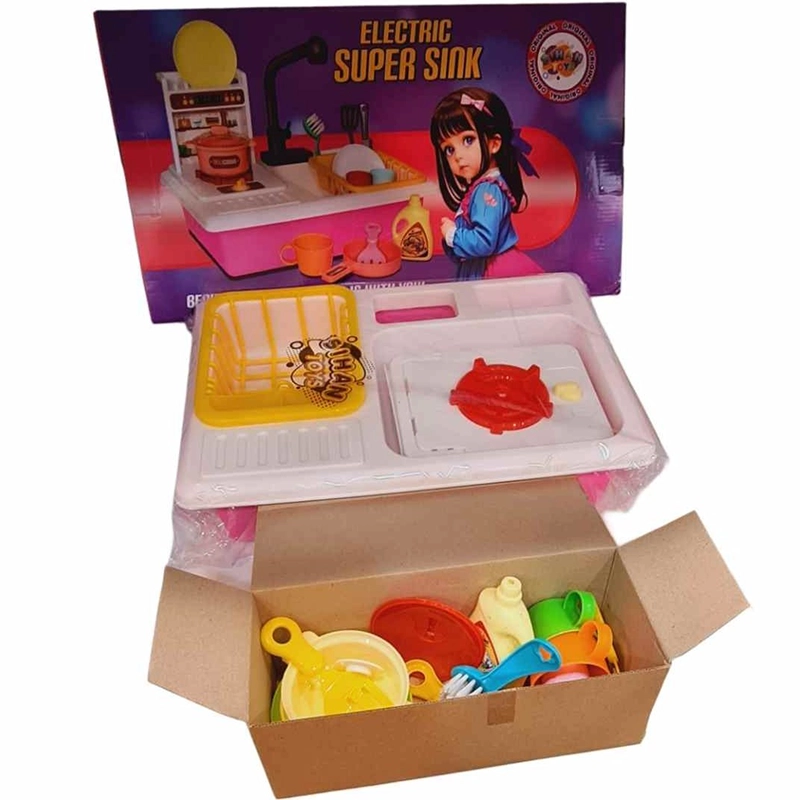اسباب بازی سینک ظرفشویی مدل Super Sink با ابعاد 50×11×27 سانتیمتر، وزن 1259 گرم، جنس پلاستیکی و 24 قطعه متنوع، باتریخور و موتورایز، مخصوص دختران خردسال طراحی شده است.