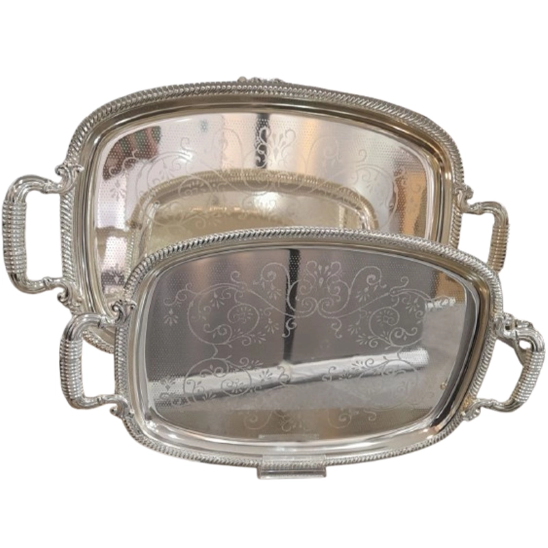 سینی عربی لعابی جفتی (استیل طرحدار) با طراحی کلاسیک و حکاکی ظریف، گزینهای شیک برای پذیرایی مجلسی است. ساختهشده از استیل براق و مقاوم در برابر زنگزدگی، شامل دو سینی در اندازههای 50×31 و 41×26 سانتیمتر.
