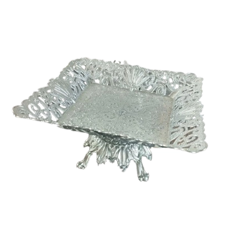 شیرینی خوری پایه دار سیلور با ابعاد ۲۰x۲۰x۱۰ سانتیمتر، ساخته شده از فلز با کیفیت ساخت ترکیه، انتخابی عالی برای پذیرایی لوکس و زیبا در منزل یا مهمانیها.