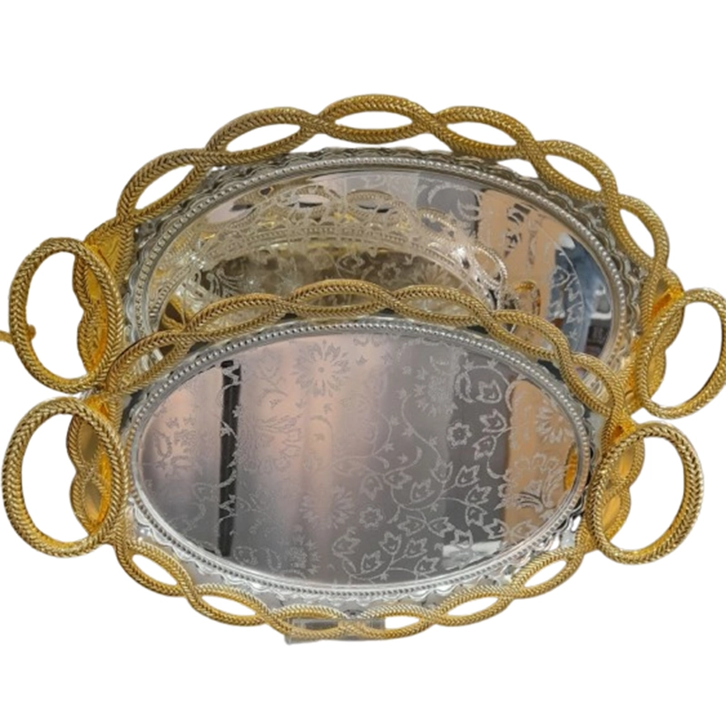 سینی عربی لعابی جفتی بیضی طرح زنجیری طلایی با ترکیب نقرهای و طلایی جلوهای شیک به میز پذیرایی میدهد. ساختهشده از استیل لعابی براق، مقاوم در برابر زنگزدگی و دارای طراحی زنجیری طلایی با نقشبرجسته زیباست.