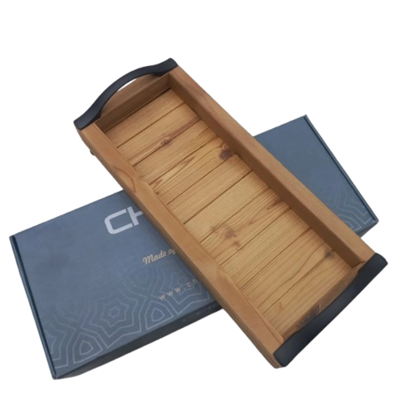 سینی چوبی پایهدار و دستهدار با ابعاد 35 در 15 سانتیمتر، مناسب پذیرایی چای و شیرینی. طراحی شیک، کیفیت بالا و انتخابی کاربردی برای خانه و مهمانیها.